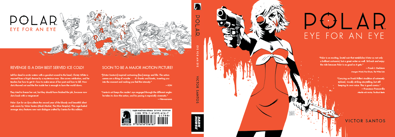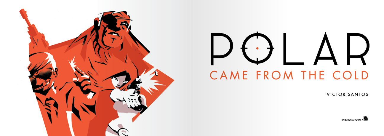 logo, collections 1–3Victor Santos, the writer and artist of Polar, was inspired by action cinema of the 1960s and 70s, and artists such as Jim Steranko, Jose Muñoz, Alberto Breccia, Alex Toth and Frank Miller. I wanted to emphasize the bold color and graphic style of Victor’s art, and avoid hiding it with “vintage” texture. My goal was to have the collections feel modern, but still pay homage to the series’ roots.
